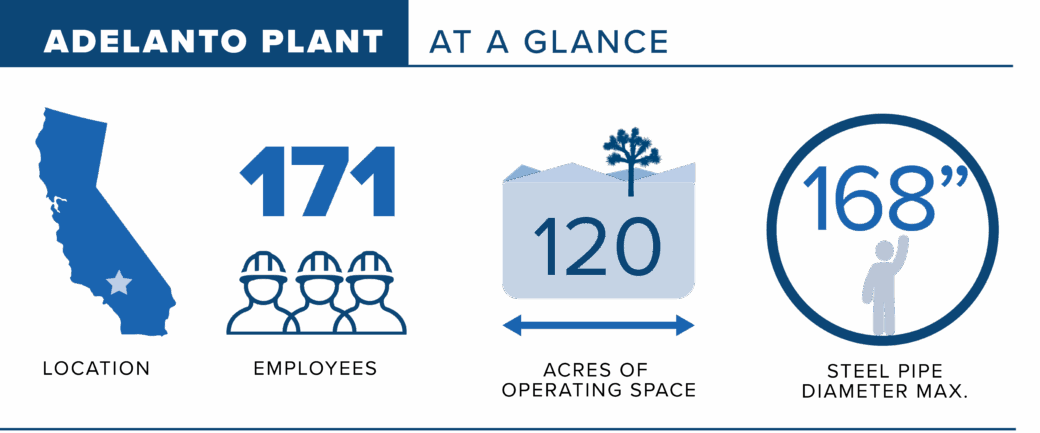 Northwest Pipe broke ground on the Adelanto facility in 1990. In the 35 years since, it has undergone three expansions and now encompasses 240,000 square feet of shop space across 120 acres. Its rural Mojave Desert location provides ample land availability and operational flexibility—advantages that have supported the plant’s continued growth and large-scale production capabilities. Today, 12 departments perform 21 manufacturing processes to produce high-quality engineered steel water transmission systems.