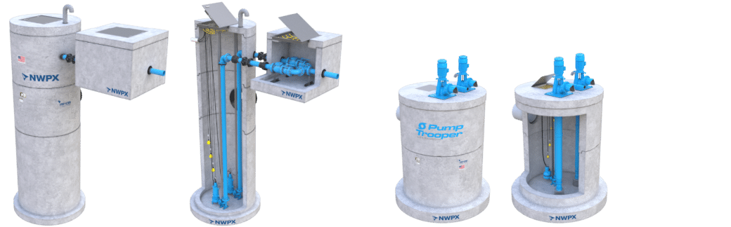 A packaged system for moving wastewater, stormwater, industrial water, and process fluids from lower to higher elevations. The NWPX PumpTrooper® integrates a precast concrete wet well, pumps, piping, valves, and automated controls in an easy-to-install turnkey solution.