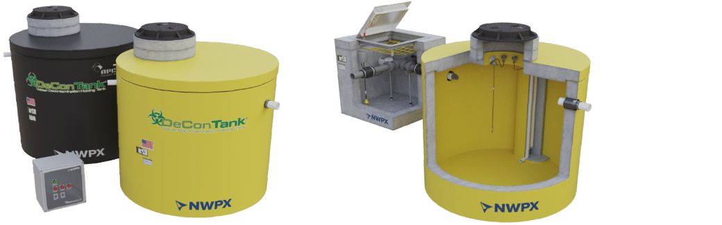 The NWPX DeconTank® is constructed of durable reinforced concrete with a single (interior) or double (interior/exterior) HDPE liner for added protection against aggressive chemicals. High-level sensors and alarm systems support safe operation and controlled management of contaminated wastewater.