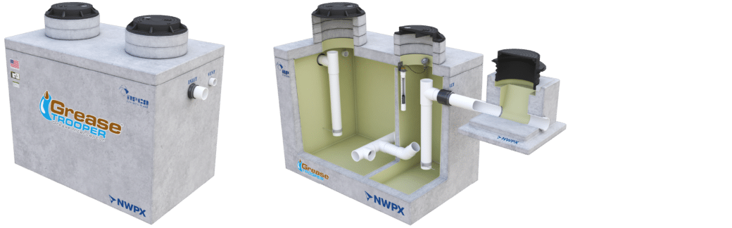 The NWPX GreaseTrooper® is a gravity grease interceptor designed to remove fats, oils, and grease (FOG) from wastewater before discharge into the sanitary sewer system. By slowing the flow of wastewater, the system allows grease to separate and rise to the surface while solids settle at the bottom, and clarified water exits to the sanitary sewer. This process supports effective FOG control across commercial, industrial, and municipal applications, helping prevent costly blockages and protecting downstream infrastructure.