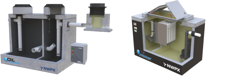 The NWPX OilTrooper® is an oil-water separator designed to remove free oils, fuels, and hydrocarbons from wastewater before discharge. By separating lighter hydrocarbons from water through gravity, these systems capture oil at the surface while allowing treated water to exit to the sanitary sewer, supporting effective pollutant control in vehicle service, fueling, and industrial applications.
