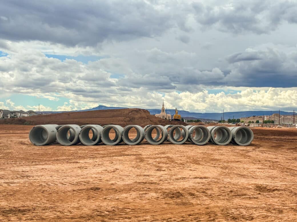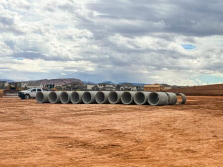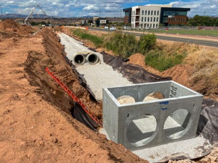 To support the project, NWPX Geneva supplied 2,400 LF of 54-inch Class III reinforced concrete pipe (RCP) for a dual 1,200-LF storm drain system. The dual line intersects five 14-by-7-foot precast vaults, also manufactured by NWPX Geneva. The project is a joint venture between the City of St. George, which oversees the stormwater conveyance portion, and the City of Washington, responsible for the wastewater portion, which includes five sanitary sewer manholes supplied by NWPX Geneva. The project was designed by Bowen Collins & Associates and installed by Suncore.