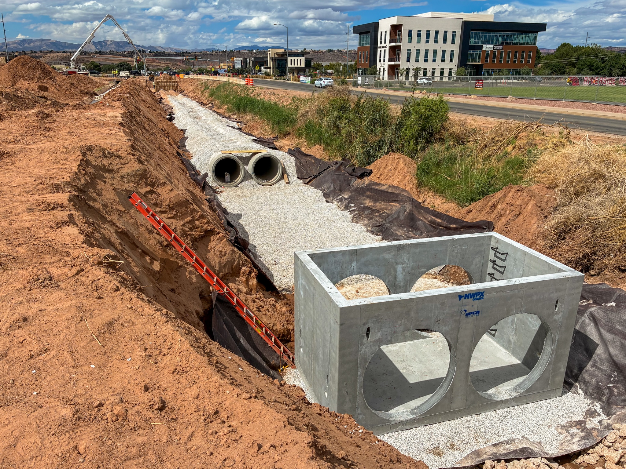 The precast storm drain vaults and sanitary sewer manholes were manufactured at NWPX Geneva’s precast plant in St. George, allowing key components to be produced locally for the project. The Southern Utah Geneva team coordinated closely with the Cities of St. George and Washington, the project engineer, and the general contractor to align production and delivery from both the St. George and Salt Lake City plants. This coordination ensured all stormwater and wastewater products met project specifications, arrived on schedule, and supported uninterrupted installation as work progressed along the corridor.