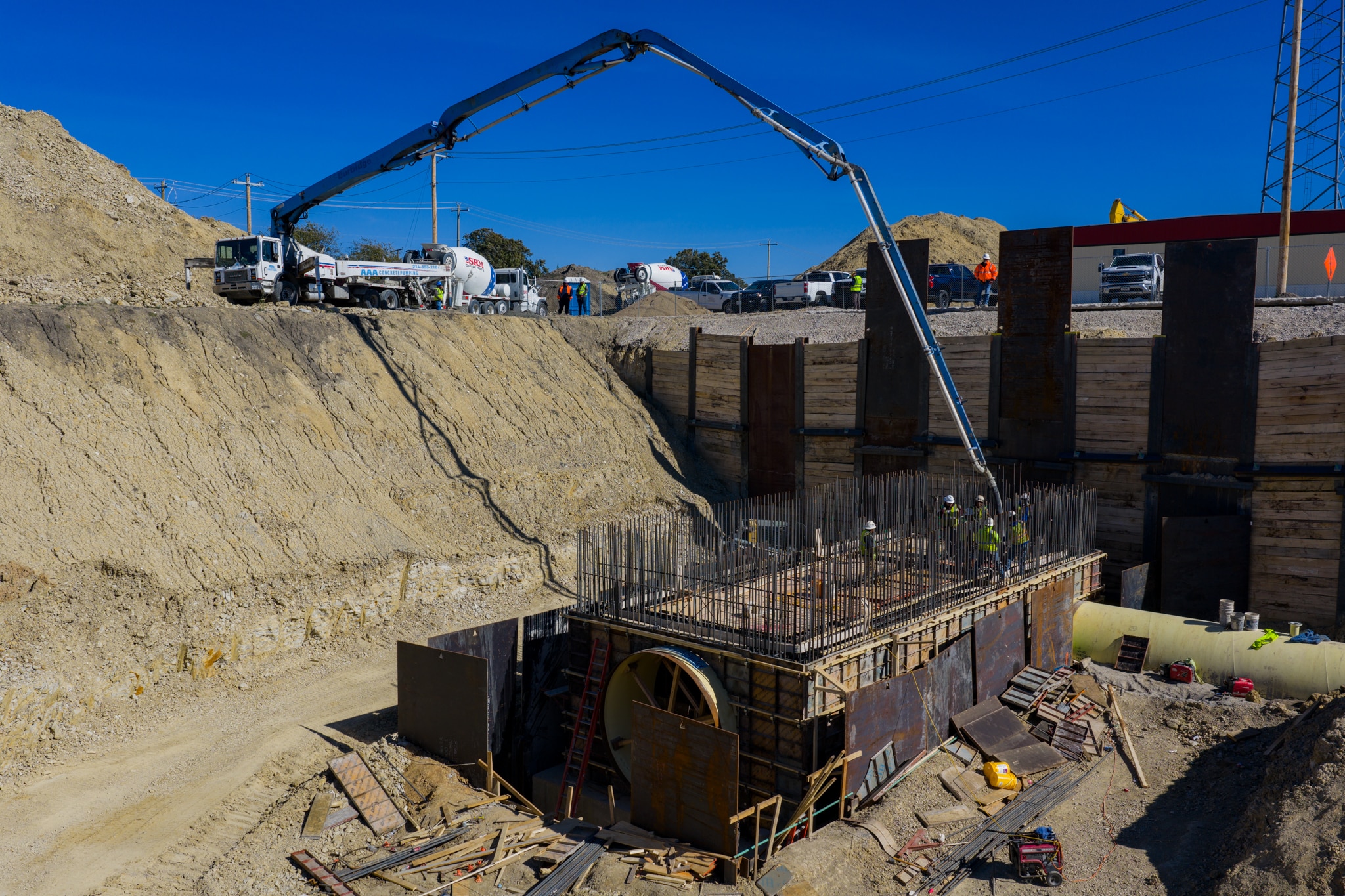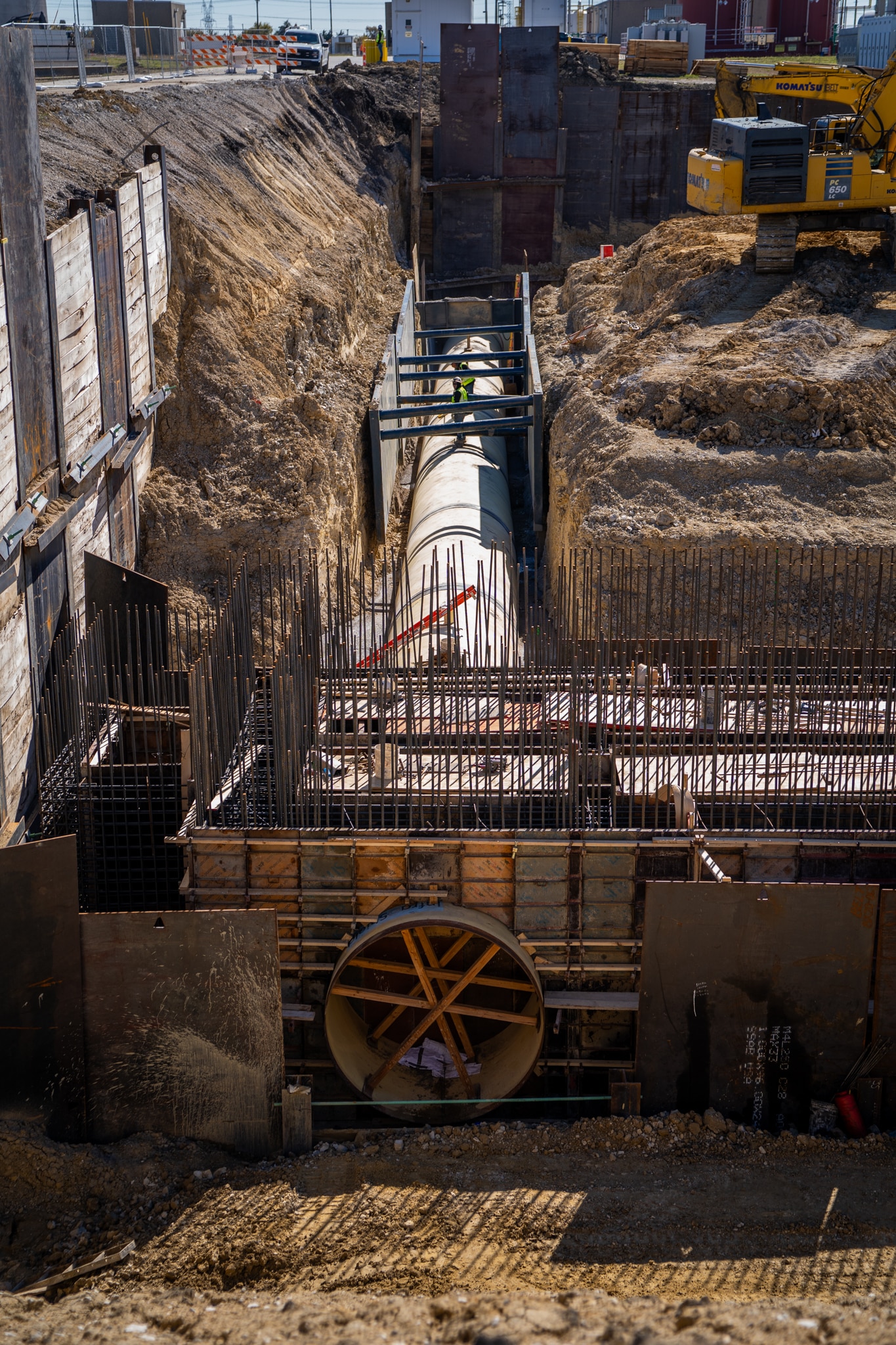 The Wylie Water Treatment Plant BAF Package 2 project is part of a major upgrade at the North Texas Municipal Water District’s Wylie facility, converting the treatment process to biologically active filtration (BAF). This phase of the plant expansion adds new large-diameter water transmission pipe that connects the existing system to a new chemical treating structure. Northwest Pipe Company supplied 873 LF of 96-inch and 204 LF of 120-inch spiralweld steel pipe for the project, including three InfraShield® Geohazard Resistant Steel Pipe (GRSP) spools. Carollo Engineers served as the project designer, with Belt Construction performing the pipeline installation and concrete work.