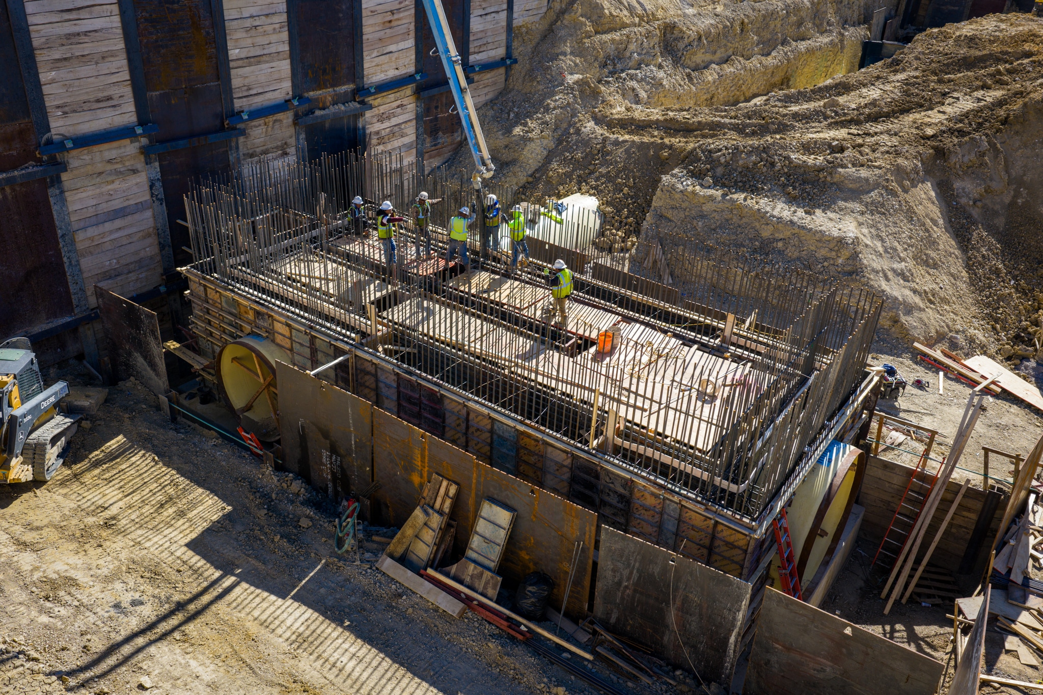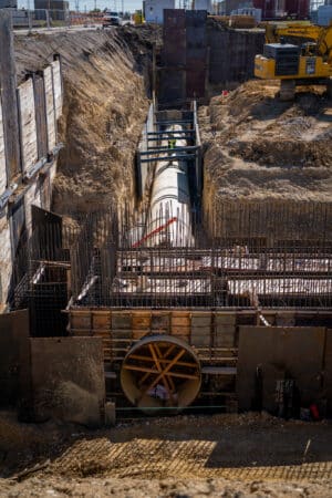 Installation followed a straightforward sequence for the Belt Construction crew. After the concrete slab was poured, the InfraShield pieces were set and braced in position, rebar and wall forms were placed, and the concrete walls were poured. Once the concrete cured and forms were removed, the crew was able to immediately tie in and continue installation of the yard piping without delay. No specialized tools or training were required, and Northwest Pipe Company provided on-site support as needed. The InfraShield pieces are polyurethane coated and lined, and the transition to the cement mortar–lined pipeline was completed without issue.